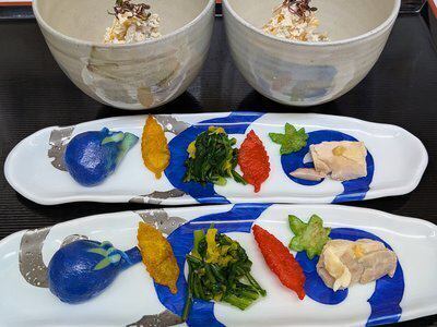 前菜は、菊菜と菊花のお浸し茄子生麩、地鶏の酒蒸し、色どり馬芋の煎餅。
